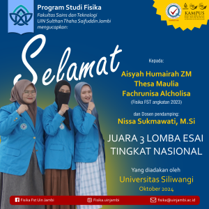 Selamat kepada Tim Prodi Fisika FST UIN Jambi: Aisyah Humairah ZM, Thesa Maulia, Fachrunisa Alcholisa, dan dosen pendamping Ibu Nissa Sukmawati, S.Si., M.Si yang telah memenangkan Lomba Essai Tingkat Nasional dengan prestasi Juara ke-3. Lomba ini diadakan oleh Universitas Siliwangi di Bulan Oktober 2024