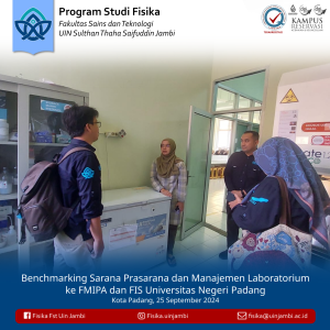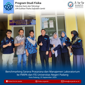 Kegiatan ini diikuti oleh utusan tujuh prodi pada Fakultas Sains dan Teknologi UIN Jambi. Di FMIPA UNP rombongan UIN Jambi disambut oleh Bapak Prof. Dr. Yohandri, M.Si dari Departemen Fisika, Ibu Dr. Dwi Hilda Putri S.Si., M.Biomed dari Departemen Biologi, Bapak Dr. Febriandi, M.Si dan Ibu Dr. Widya Prarikeslan, M.Si dari Departemen Geografi. Tim UIN Jambi diberikan kesempatan untuk berkeliling melihat sarana prasarana laboratorium serta mendapatkan materi manajemen pengelolaan laboratorium baik itu laboratorium pendidikan dan juga laboratorium riset mahasiswa serta dosen.