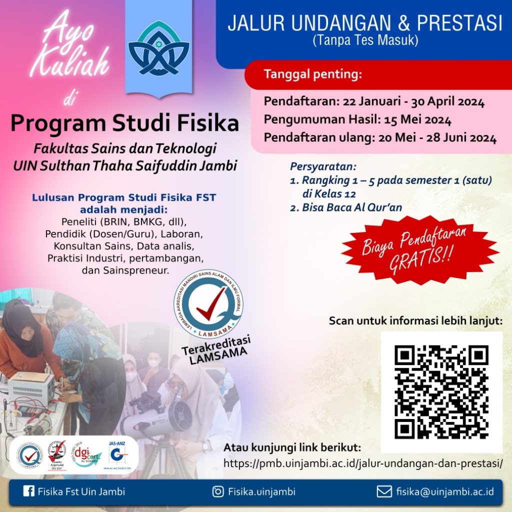 Mari kuliah di Program Studi Fisika Fakultas Sains dan Teknologi UIN Sutha Jambi melalui Jalur Undangan & Prestasi yang dilaksanakan tanpa tes dengan syarat ketentuan dapat dilihat pada link berikut: https://pmb.uinjambi.ac.id/jalur-undangan-dan-prestasi/
