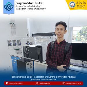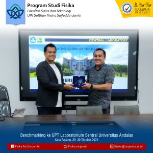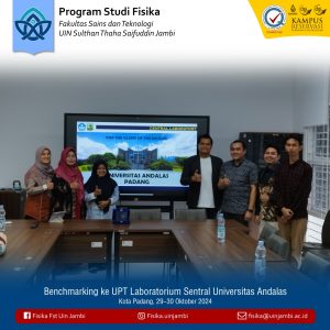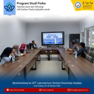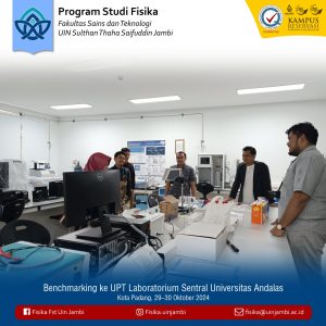 Pada Tanggal 29 Oktober 2024, tim Program Studi Fisika FST UIN Jambi mengunjungi dan melaksanakan benchmarking ke Laboratorium Sentral Universitas Andalas (UNAND). Kunjungan ini langsung disambut oleh Kepala UPT Laboratorium Sentral Dr. Eng. Yulia Eka Putri dan Kepala Laboratorium Riset Dr. Eng. Matlal Fajri Alif. Dari pihak UIN Jambi yang turut hadir adalah Ketua Prodi Fisika, Sekretaris Prodi Fisika, utusan dosen fisika, dan utusan mahasiswa fisika.