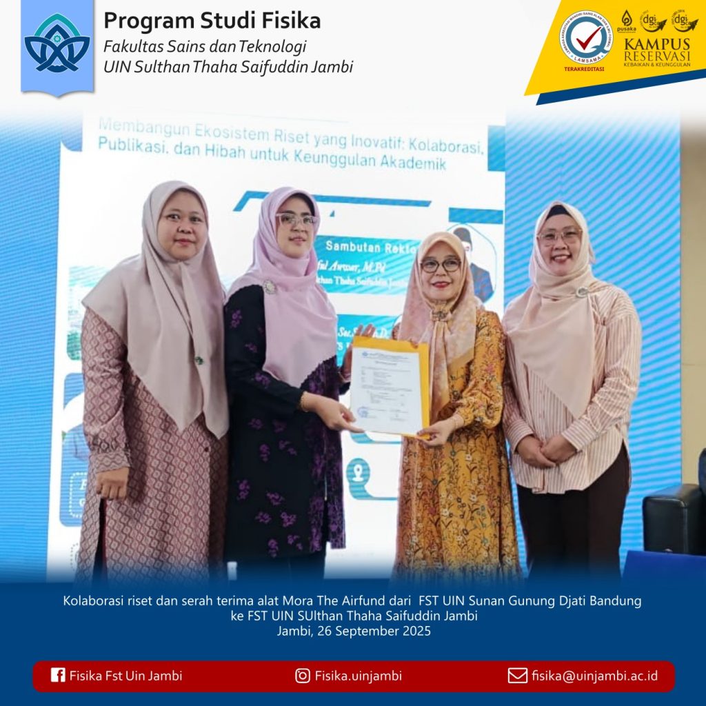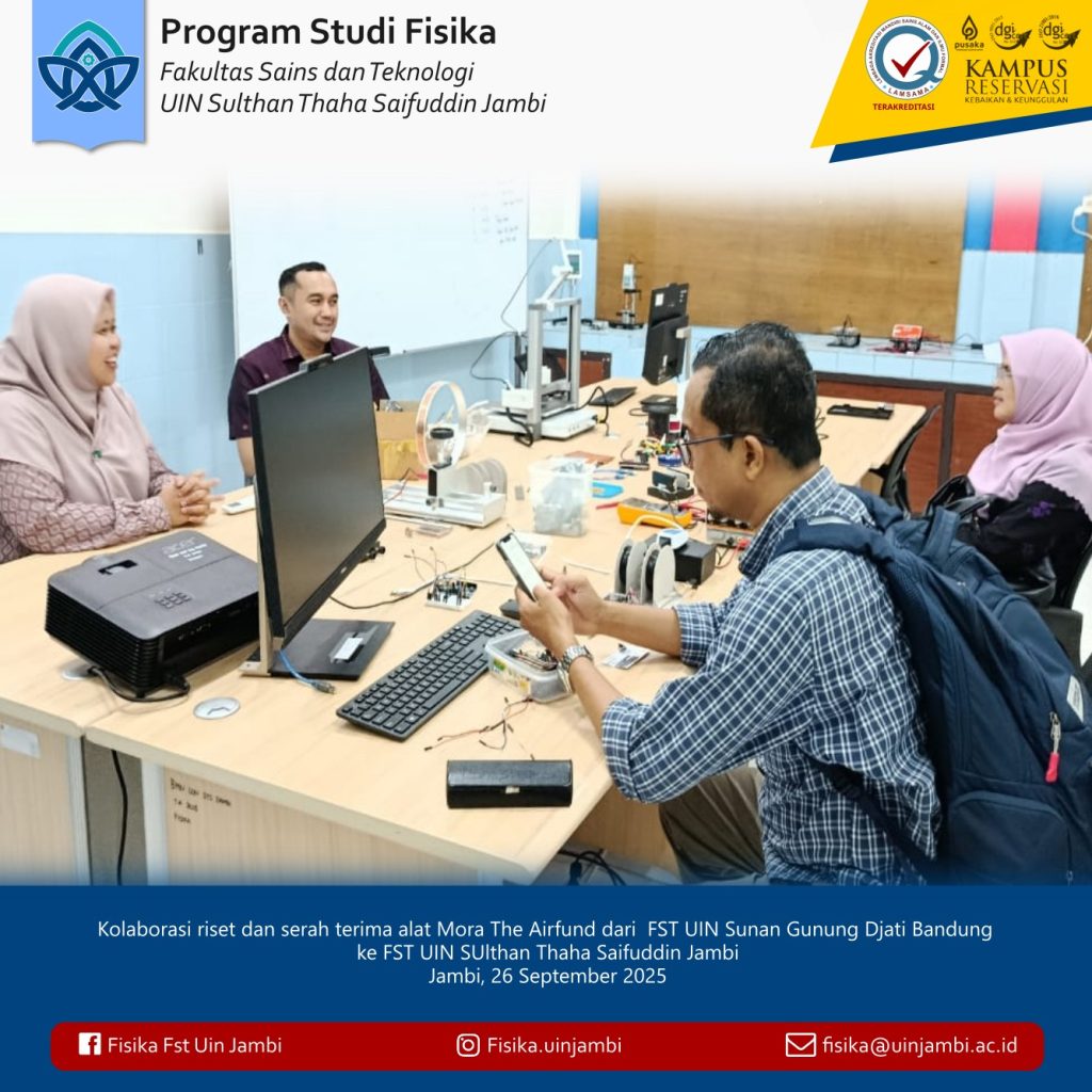 Jambi, 26 September 2025 – Fakultas Sains dan Teknologi (FST) UIN Sulthan Thaha Saifuddin Jambi menerima secara resmi penyerahan alat Mora The Airfund dari UIN Sunan Gunung Djati Bandung. Kegiatan ini merupakan bagian dari implementasi program Riset Indonesia Bangkit Kolaborasi yang digagas Kementerian Agama melalui Mora The Airfund bekerja sama dengan Lembaga Pengelola Dana Pendidikan (LPDP) Kementerian Keuangan Republik Indonesia.