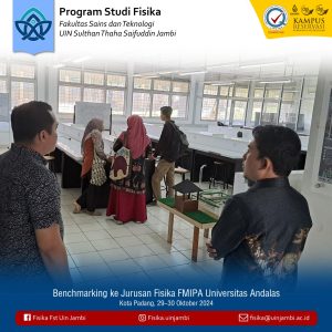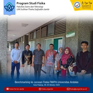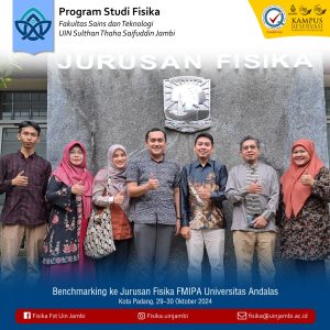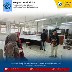 Pada Tanggal 29 Oktober 2024, Program Studi Fisika melaksanakan kunjungan ke Jurusan Fisika Universitas Andalas. Kunjungan ini disambut oleh Sekretaris Jurusan Fisika Bapak Trengginas Eka Putra Sutantyo, M.Si dan Kepala Laboratorium Fisika Ibu Dr. Meqorry Yusfi, M.Si. Pada kegiatan ini tim dari Prodi Fisika UIN Jambi melakukan sharing dan belajar tentang mutu layanan dan peningkatan standar laboratorum fisika yang sesuai standar akreditasi unggul.