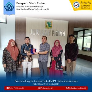 Jurusan Fisika UNAND yang berumur hampir 30 Tahun telah memiliki banyak pengalaman dan prestasi-prestasi baik dalam akreditasi maupun penghargaan-penghargaan lainnya. Begitu juga prestasi akademik dan non akademik mahasiswanya yang telah banyak diraih baik skala nasional maupun internasional. Pengalaman dan berbagai kebijakan yang telah dilaksanakan oleh Jurusan Fisika UNAND memberikan pengetahuan dan ilmu yang sangat berarti bagi Tim UIN Jambi dan akan dibawa serta diterapkan ke Prodi Fisika FST UIN Jambi.